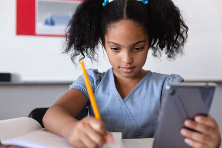 Biracial elementary schoolgirl using digital tablet while writing on book at desk in classroom. unaltered, education, learning, studying, concentration, wireless technology and school concept.