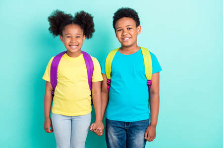 Portrait of two attractive cheerful kids classmates holding hands isolated over bright teal turquoise color background