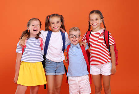 Group of best friends schoolkids posing together while standing close to each other, smiling at camera, happy to meet again after summer holidays, cheerful classmates isolated on orange background