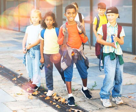 Happy preteen children with exercise books and backpacks joyfully talking after lessons at schoolyard in front of school