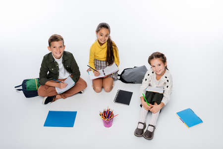 high angle view of cheerful schoolboy and schoolgirls sitting with notebooks while drawing on white