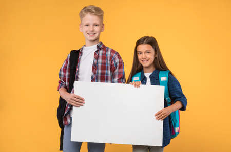 Good Offer. Two pupils holding blank white signboard and smiling, standing on yellow studio wall, free space