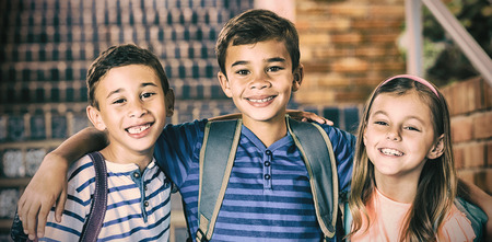 Portrait of schoolchildren smiling at camera in corridor of school building