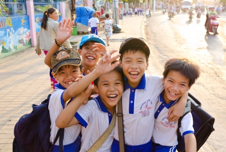 PHAN THIET, VIETNAM - MARCH 5 Unidentified local Vietnamese schoolboys express joy towards a foreign tourist, March 5, 2013 in Phan Thiet, Vietnam