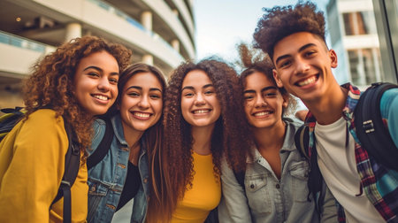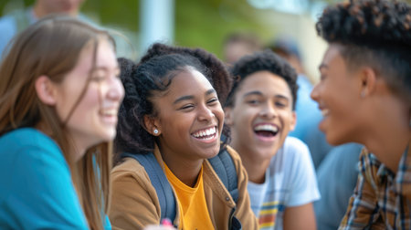An image of smiling youngsters hanging outside a school. GENERATE AI