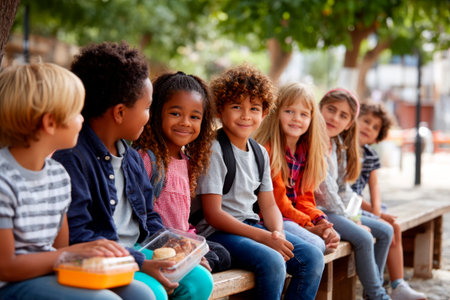 group of children sitting on bench in schoolyard, lunch boxes, chatting and laughing, multi-ethnic, real emotion, warm sunny day, lifestyle school image