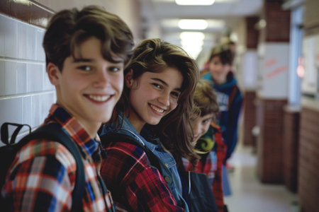 A group of happy students stands closely together their smiling faces brightening the school corridor during a busy day.