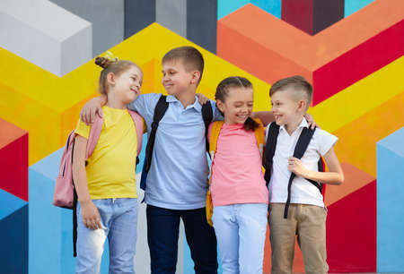 Happy schoolkids hugging near colorful wall