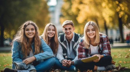 Generative AI : University students studying together sitting in college campus Group of teens hanging out in public park High school and millennial generation lifestyle concept