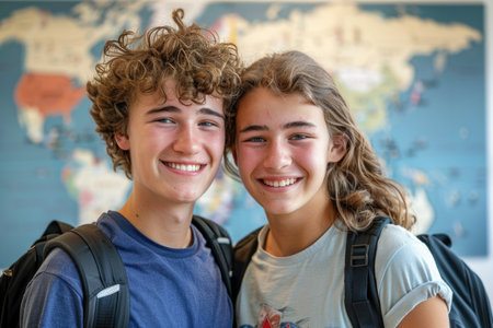 Two young people smiling at the camera with backpacks. The girl is wearing a blue shirt and the boy is wearing a blue shirt