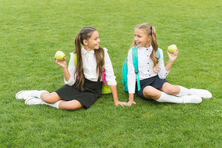 Little girls friends eat healthy school lunch, vitamin food concept