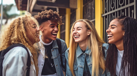 Generative AI : Multiracial friends talking and laughing out loud on city street International students having fun sitting outside college university Funny guys and girls Youth l