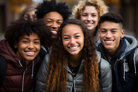 Five diverse schoolmates, clad in casual winter attire and backpacks, illuminating friendship and diversity within an academic setting.
