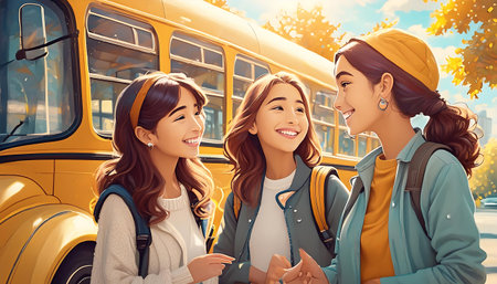 Happy young women with backpacks looking at each other and smiling while standing near school bus outdoors