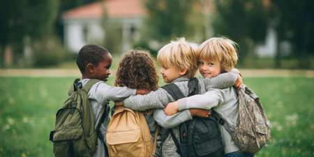 Four young children with backpacks, seen from behind with arms around each other, share a moment of friendship and togetherness in a green outdoor setting before school.