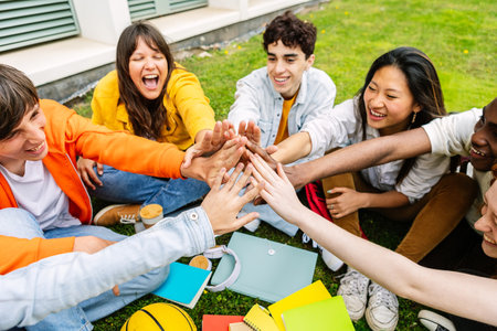 Joyful group of diverse college students giving high five together outdoors