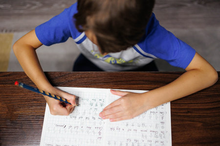 Kid siting on table doing homework,Child boy holding pencil writing on white paper,Young boy practicing Chinese characters at home. Elementary school. Top view