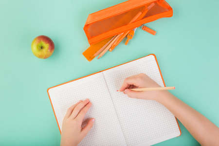 Top view of child hands writing in an empty notebook. Doing homework concept. Orange color.