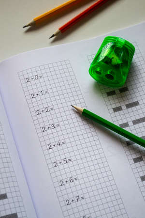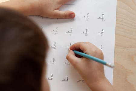 A schoolboy doing math lesson sitting at desk in the children room,top view, close up