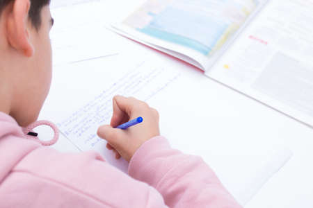 Hands of schoolkid doing math homework, he is solving equations and writing results in textbook
