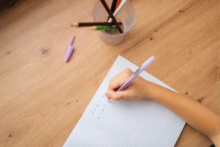 Close-up cropped shot of unrecognizable primary little child girl doing homework writing in copybook with pen sitting at table. High-angle view of elementary little school girl learning at home.