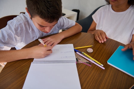 Close-up of unrecognizable elementary student boy sitting at table and solving mathematical tasks on paper