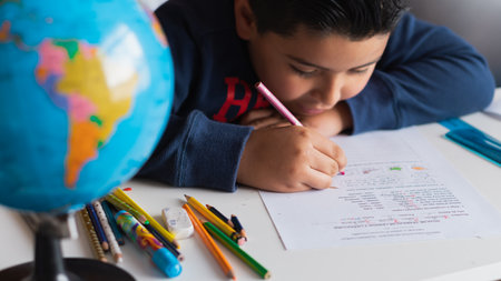 A young boy focuses on his homework while a woman assists him at a wooden table. Various stationery items are scattered, reflecting learning and support in an educational setting.