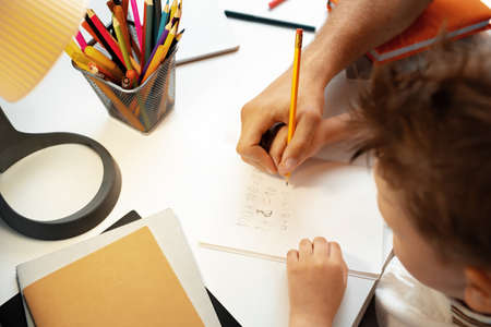 Cropped shot father helping his boy with homework, Dad and Son doing homework together, Teacher teaching little boy how to write. Man hand holding pencil, Education concept