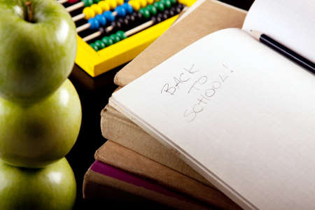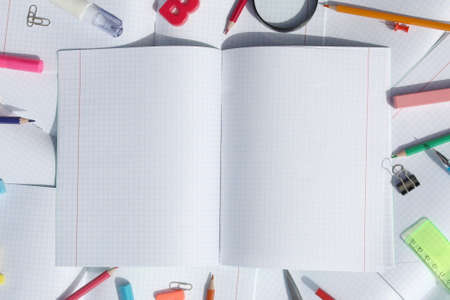 Back to school, alarm clock, open blank notebook, stack of books and pencils on bright background, learning concept, homework
