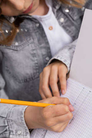 Close-up cropped shot of unrecognizable elementary little child girl writing doing homework sitting at home table by window. Concentrated primary kid studying alone making note with pen at bedroom.