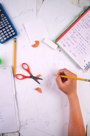 Top view schoolchild, primary online school student doing math geometry task on copybook. Workbooks, pencil-case, stationery, school supplies and measutring rulers lying on the table. Homeschooling