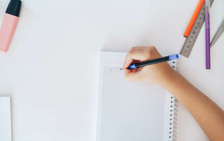 High-angle view of unrecognizable elementary little child girl doing homework writing in copybook with pen sitting at table. Close-up cropped shot of primary little school girl learning at home.