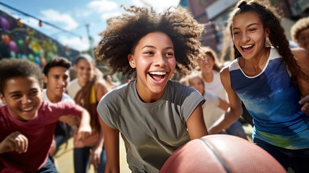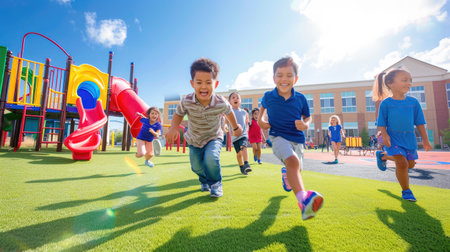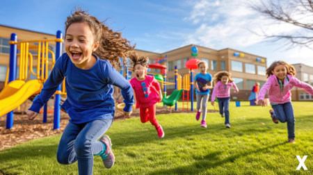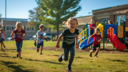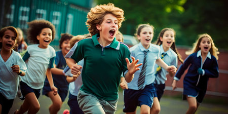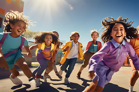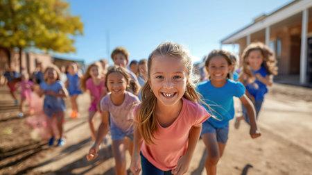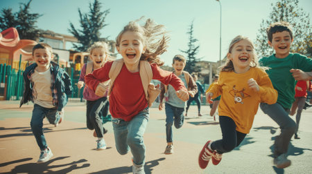Children running and laughing outside on a sunny day. A group of happy kids are enjoying their time together.