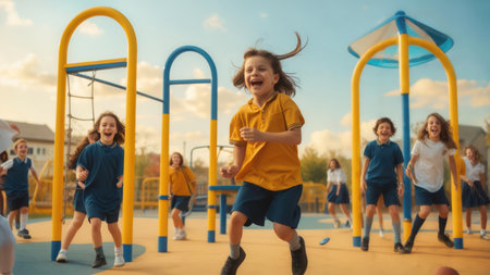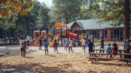 Children of various ages are joyfully playing in a bustling playground during a sunny afternoon. The warm sunlight creates a cheerful atmosphere filled with laughter.