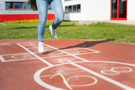 Girl Jumping while Playing Hopscotch at park. Close-up of little cute Girls on Children Playground outdoors. Legs of Kids Jumps Hopscotch on asphalt.