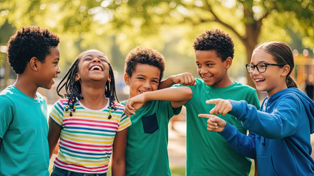 A group of diverse children are shown smiling and laughing in an outdoor setting. The image displays bright colors and natural light with a shallow depth of field. The style is candid, suggesting friendship and joy. Suitable for editorial or commercial content related to childhood and community.