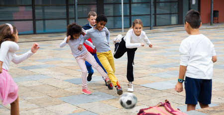 Group of children playing on playground in autumn day. Boys and girls having fun together.