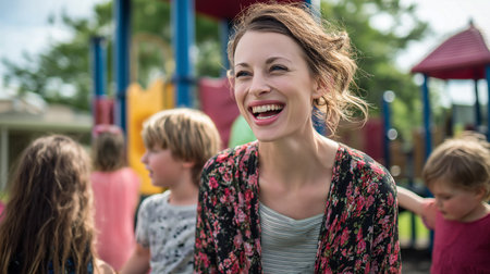 A woman radiates happiness while children play in a cheerful, sunlit playground.