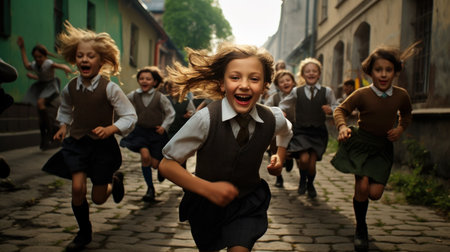A lively group of children joyfully running down the street together, kids running school, AI Generated