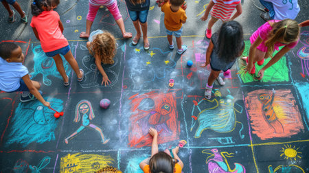 A happy group of children are engaging in leisurely sports and recreation by sitting on the ground, drawing with chalk. AIG41