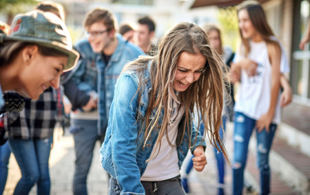 A teenage girl, in visible agony, bends forward as laughter echoes around her, portraying the cruelty of verbal bullying in a school setting. The emphasizes the severity of bullying among youth