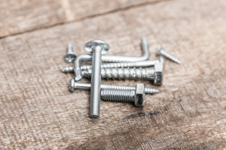 Various metallic fasteners arranged on a wooden surface for a construction project
