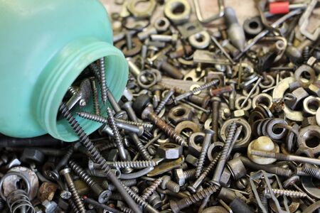 Repair. Screws and washers on the desktop. The concept of a repair shop. Close-up.