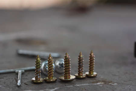 Image with sekected focus on the some screws are on the working surface for plasterboard - drywall -for gypsum walls in apartment is under construction, remodeling, renovation, extension, restoration and reconstruction.