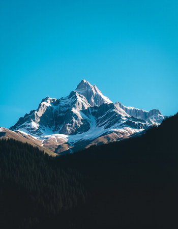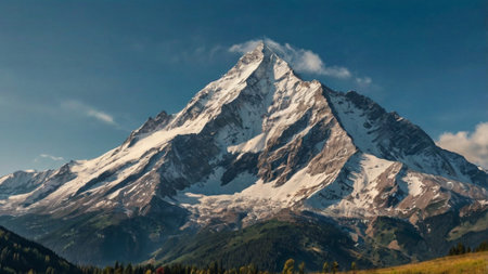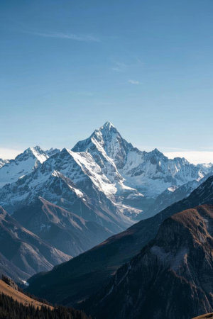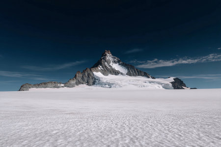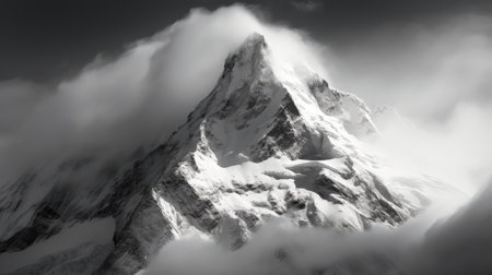 Majestic mountain peak, surrounded by snow and dramatic sky generated by artificial intelligence
