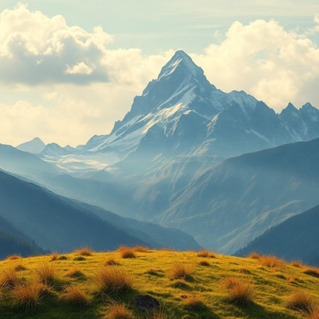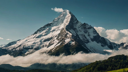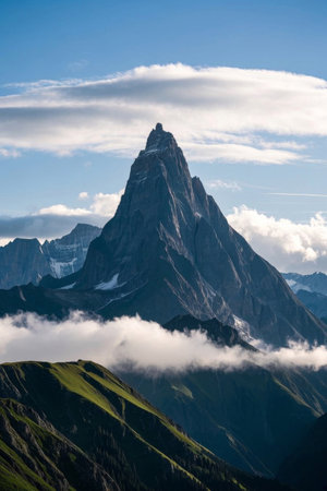 a stunning sunrise over a majestic mountain, captured in ultra high resolution photography. the mountains are adorned with clouds, creating a mystical atmosphere. the morning mist allows godrays to shine through, adding to the epic beauty of the scene. this breathtaking image was taken with a wide angle lens on a hasselblad camera. ai generated