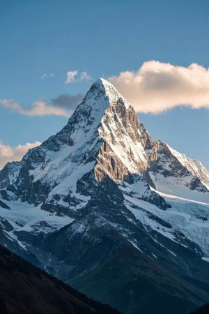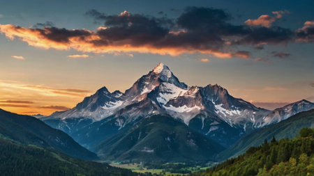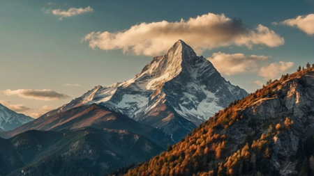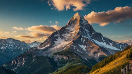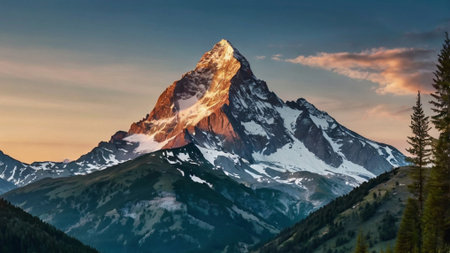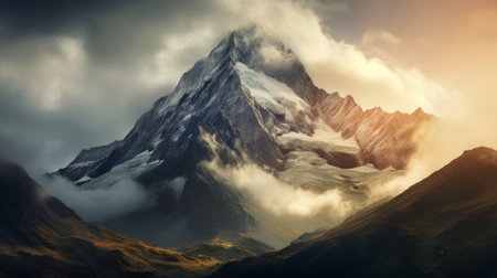 A stunning mountain peak is bathed in the golden light of a sunset, clouds swirling around its majestic form.