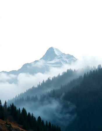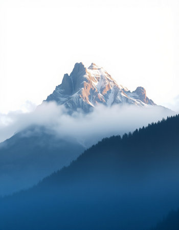 Isolated winter region featuring an ice-covered mountain surrounded by clouds, embodying nature’s quiet strength