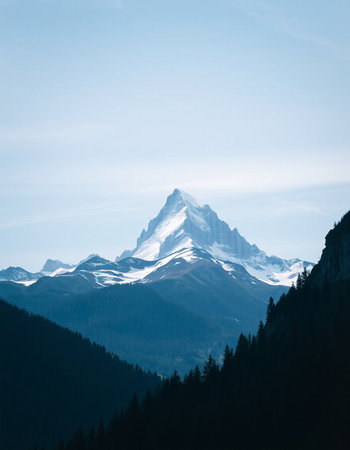 Mountain landscape with snow-capped peaks and coniferous forest.
