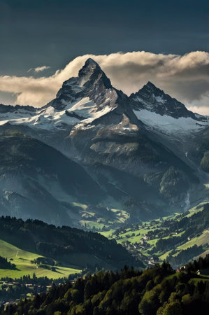 Majestic snow-covered peaks overlook a green valley dotted with small villages, exuding a peaceful and scenic atmosphere Ideal for travel and landscape designs.